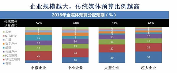 為什么?首先說說電視。企業規模越大,選擇電視媒體和傳統媒體的預算比例就越高。這并不是偶然的,因為所有的大型企業它們都是建立在工業生產的規模化生產的效率上,只有大的規模,才可以獲得更高的利潤才可以形成發展空間。所以當需要大規模生產基礎上的營銷活動,勢必要大規模的消費者觸達,而這種規模性的營銷——定時的爆發點的、有傳播勢能的營銷,其實是在以電視為首的這樣傳統媒體上予以形成的。所以我們會看企業規模越大,在傳統媒體上的預算是越高的。