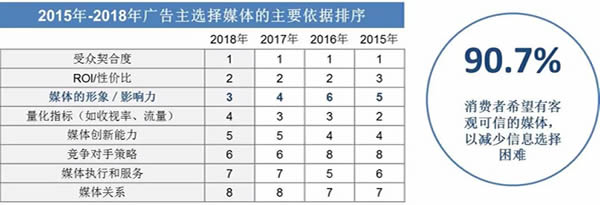 首先就是媒體的品牌化,也可以說是媒體可信度的兌現,無論什么方式,其實它是可以去兌現的維度。從廣告主調研的結果看,媒體的形象/影響力在15年的時候排在第5位5,后來下降成6,去年回到4,那么今年更是回到了3意味著什么?當我們的信息或者非常碎片化的時候,以及所有的信息過載的這個狀態下的時候,能不能給我靠譜的信息變成了重要的事情,90%以上的消費者希望有可信的媒體減少信息選擇困難。